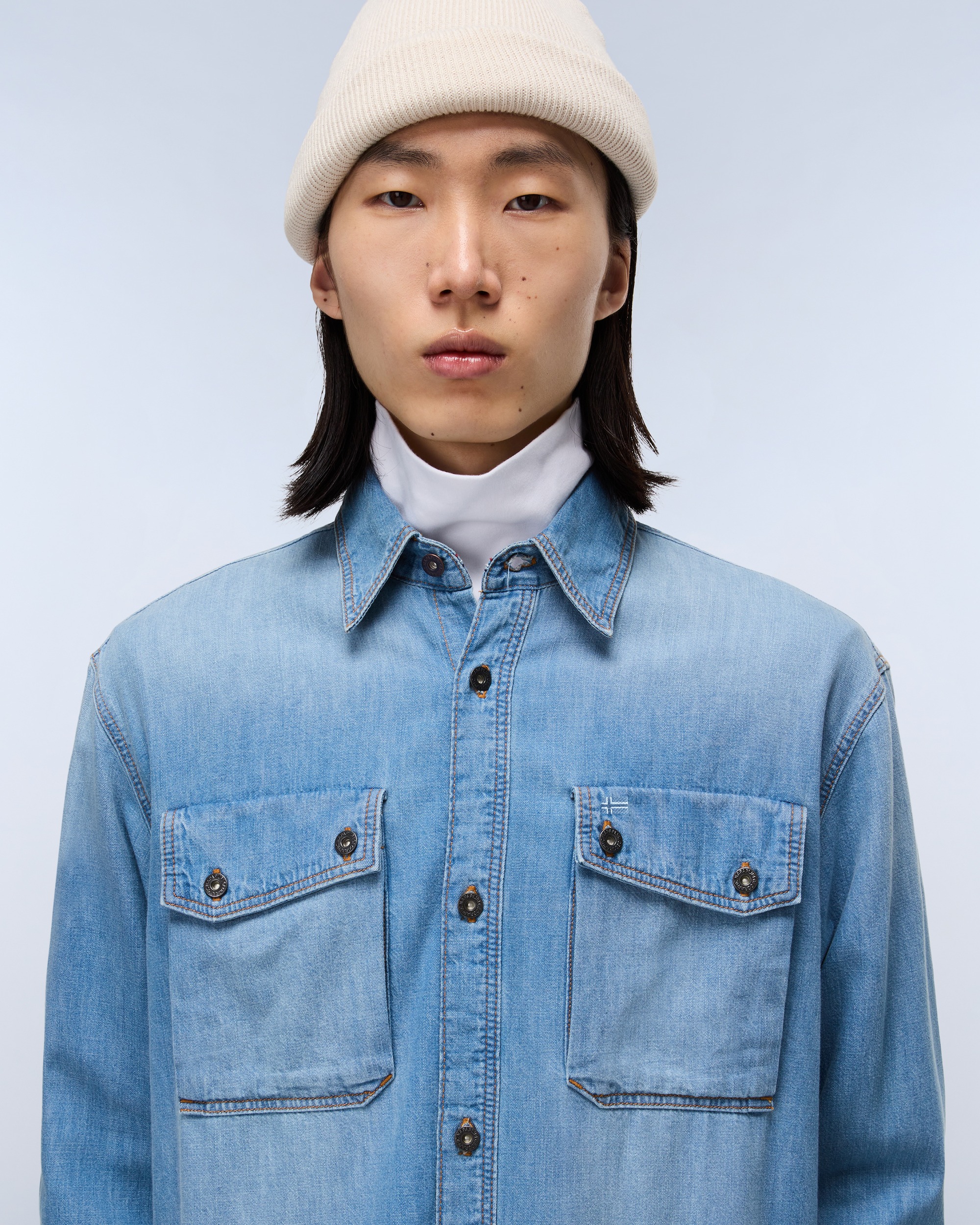 Estompând granița dintre o cămașă și o geacă ușoară, cămașa lungă din denim Kiene este ideală pentru stratificare. Este finisată cu un tiv evazat, două buzunare pe piept și o broderie cu steag în tonuri pastelate pe buzunarul din stânga-sus.