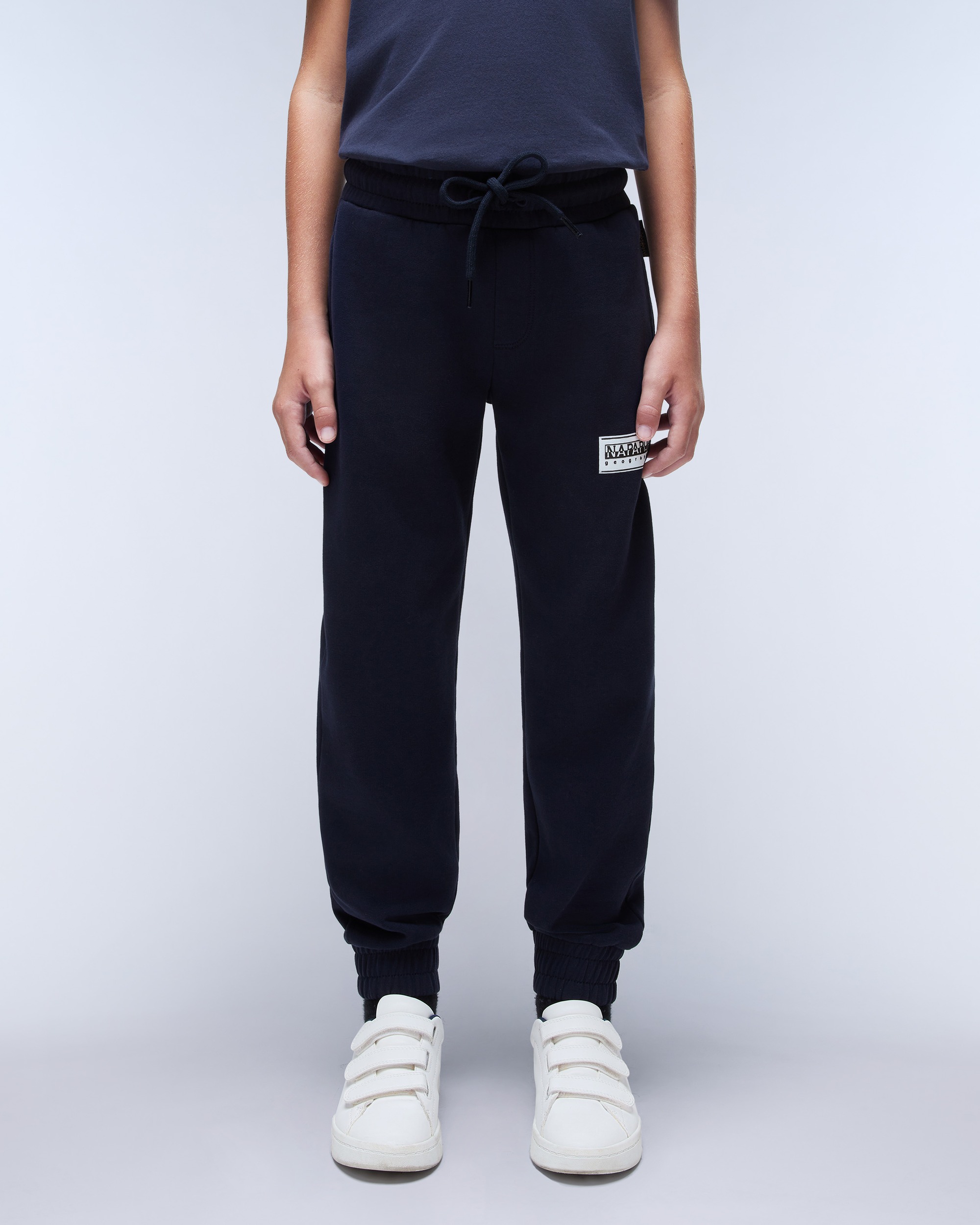 Joggerii Chamois pentru copii combin un estetic sport cu un confort fiabil, datorită taliei elastice și reglabile, a tivurilor elastice și a printului Napapijri Geographic pe picior.