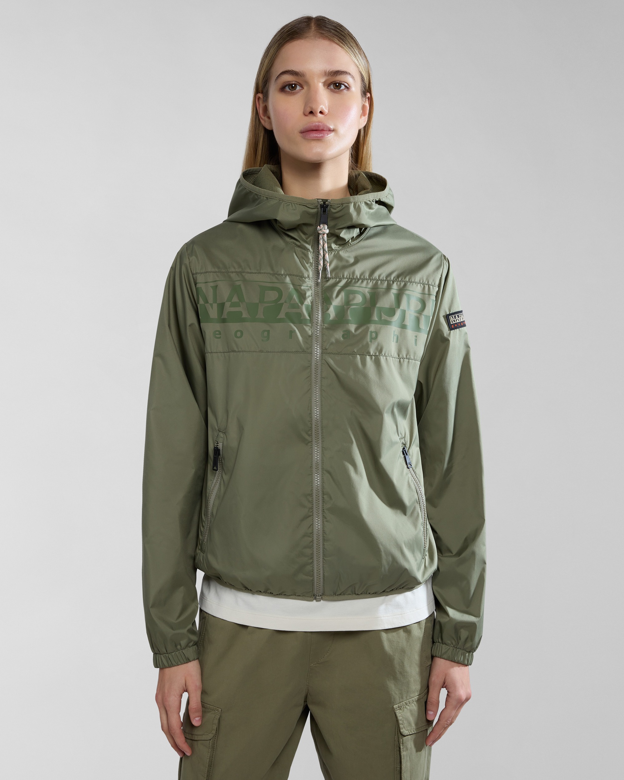 Jacheta scurtă Raymi pentru femei este o piesă de zi cu zi, stilată și versatilă. Gândită să fie purtată peste straturi ușoare pentru un plus de căldură, are închidere cu fermoar, glugă ascunsă, croială lejeră, căptușeală din plasă și printul Napapijri Geographic pe piept.